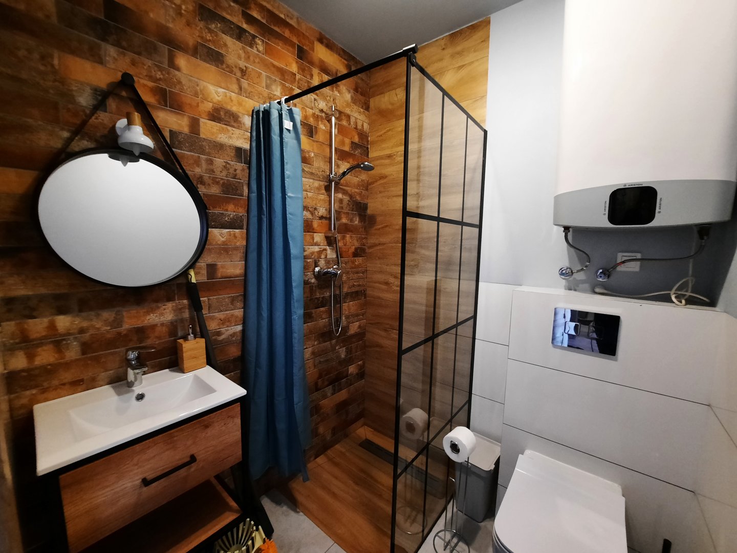 Łazienka to wygodna kabina prysznicowa, toaleta, umywalka.